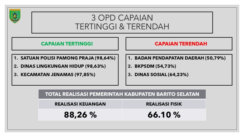 Dengan capaian realisasi keuangan sebesar 88,26 persen dan realisasi fisik 66,10 persen, Pemerintah Kabupaten Barito Selatan optimistis dapat terus memperbaiki kualitas pengelolaan keuangan daerah demi terwujudnya tata kelola pemerintahan yang baik dan akuntabel.