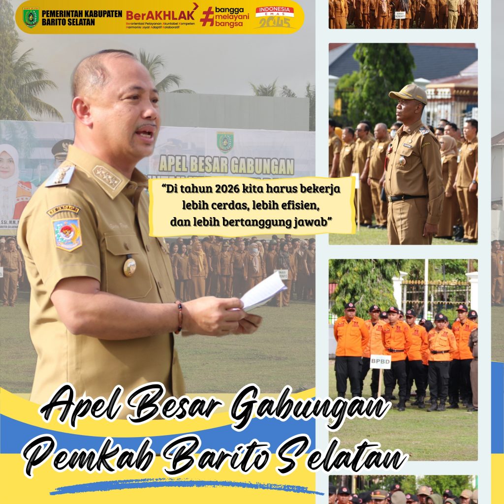 Bupati Barito Selatan Dr. H. Eddy Raya Samsuri, S.T., MM memimpin langsung Apel Besar Gabungan Di lingkup Pemerintah Kabupaten Barito Selatan bertempat di Halaman Kantor Bupati Barito Selatan, Senin, 05/01/2026 (pagi).