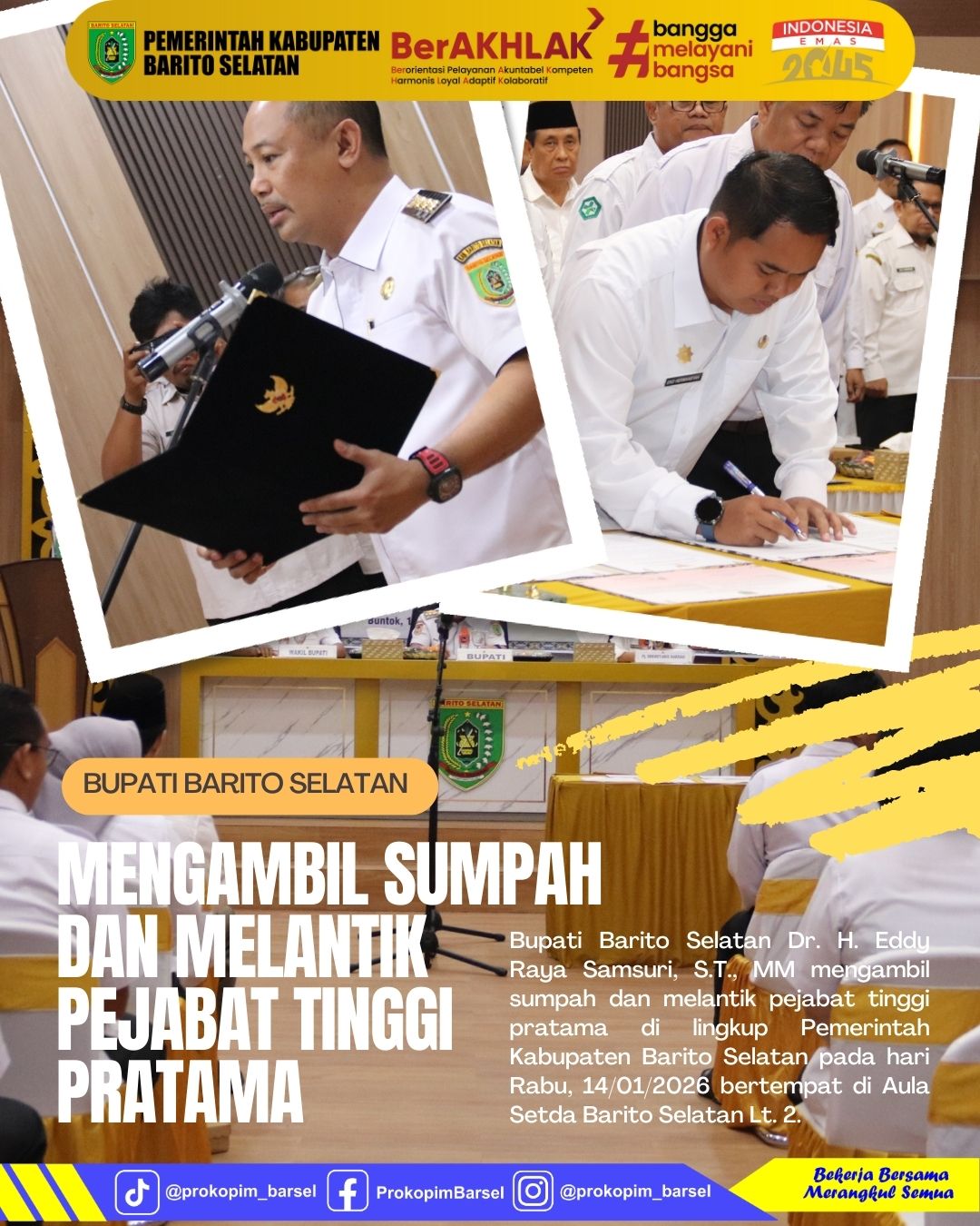 Dalam amanatnya, Bupati menekankan 6 poin utama bagi para ASN di lingkup Pemerintah Kabupaten Barito Selatan antara lain : meningkatkan dan menjaga disiplin pegawai, efisiensi anggaran tahun 2026, kesiapsiagaan bencana, serta memastikan jalur koordinasi dan hierarki organisasi berjalan sesuai ketentuan yang berlaku, selain itu bupati juga menekankan pentingnya menjaga kebersihan lingkungan dan menjauhi praktik narkoba dan lainnya. #protokol #baritoselatan