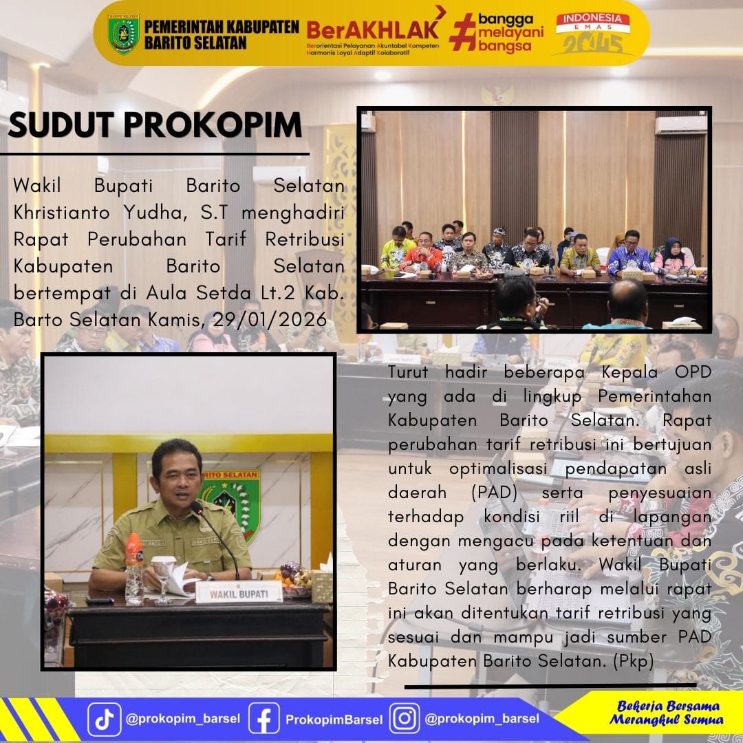 Turut hadir beberapa kepala OPD dilingkup Pemerintahan Kabupaten Barito Selatan. Rapat perubahan tarif retribusi ini bertujuan untuk optimalisasi pendapatan asli daerah (PAD) serta penyesuaian riil dilapangan mengacu pada ketentuan dan aturan yang berlaku. Wakil Bupati Barito Selatan berharap melalui rapat ini akan ditentukan tarif retribusi yang sesuai dan mampu jadi sumber PAD bagi Kabupaten Barito Selatan. (Pkp)