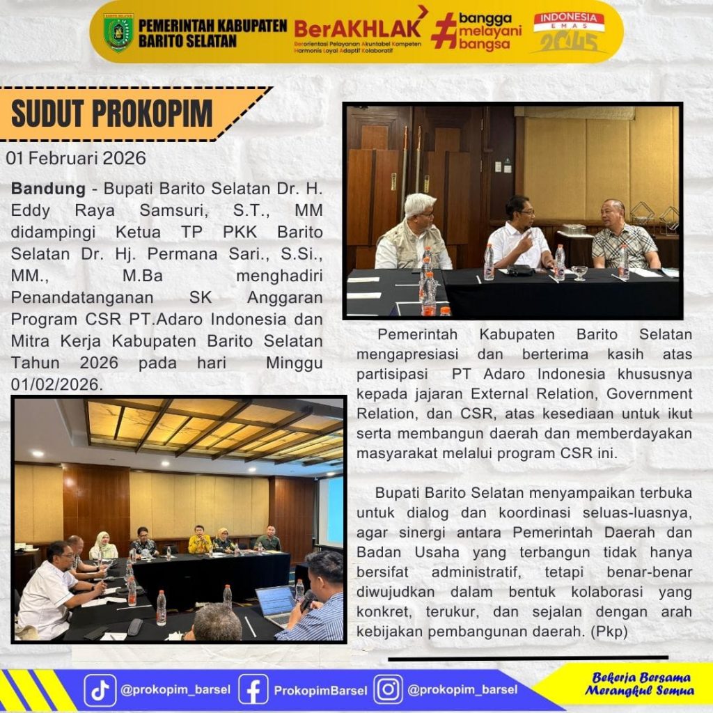 Bupati Barito Selatan Dr. H. Eddy Raya Samsuri, S.T., MM didampingi Ketua TP PKK Barito Selatan Dr. Hj. Permana Sari., S.Si., MM., M.Ba menghadiri Penandatanganan SK Anggaran Program CSR PT.Adaro Indonesia dan Mitra Kerja Kabupaten Barito Selatan Tahun 2026 pada hari Minggu, 01/02/2026.