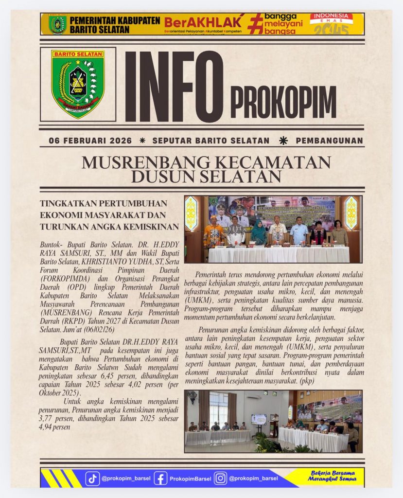 Bupati Barito Selatan Dr. H. Eddy Raya Samsuri, S.T., MM. didampingi Ketua TP-PKK Barito Selatan Dr. Hj. Permana Sari., S.Si., MM., M.Ba dan Wakil Bupati Barito Selatan Khristianto Yudha, S.T beserta Pj. Sekda Barito Selatan Dr. Ita Minarni, S.T., M.T bersama unsur Forkopimda dan Kepala OPD Kab. Barito Selatan menghadiri Musyawarah Perencanaan Pembangunan Daerah (MUSRENBANG) RKPD Kab. Barito Selatan Tahun 2027 bertempat di Aula Kecamatan Dusun Selatan, Jumat 06/02/2026.