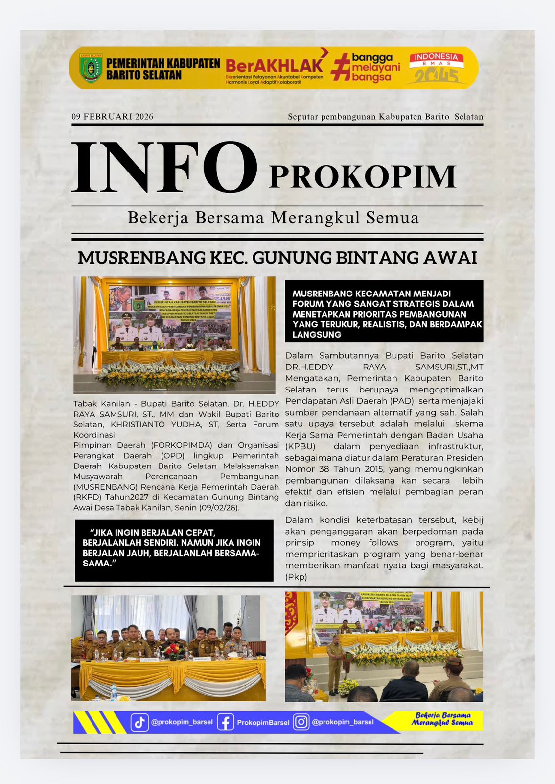 Bupati Barito Selatan Dr. H. Eddy Raya Samsuri, S.T., MM. didampingi Ketua TP-PKK Barito Selatan Dr. Hj. Permana Sari., S.Si., MM., M.Ba dan Wakil Bupati Barito Selatan Khristianto Yudha, S.T bersama unsur Forkopimda dan Kepala OPD Kab. Barito Selatan menghadiri Musyawarah Perencanaan Pembangunan Daerah (MUSRENBANG) RKPD Kab. Barito Selatan Tahun 2027 di Tabak Kanilan, Kecamatan Gunung Bintang Awai Senin 09/02/2026. Informasi seputar kegiatan dapa disimak melalui konten dibawah ini (PkP)
