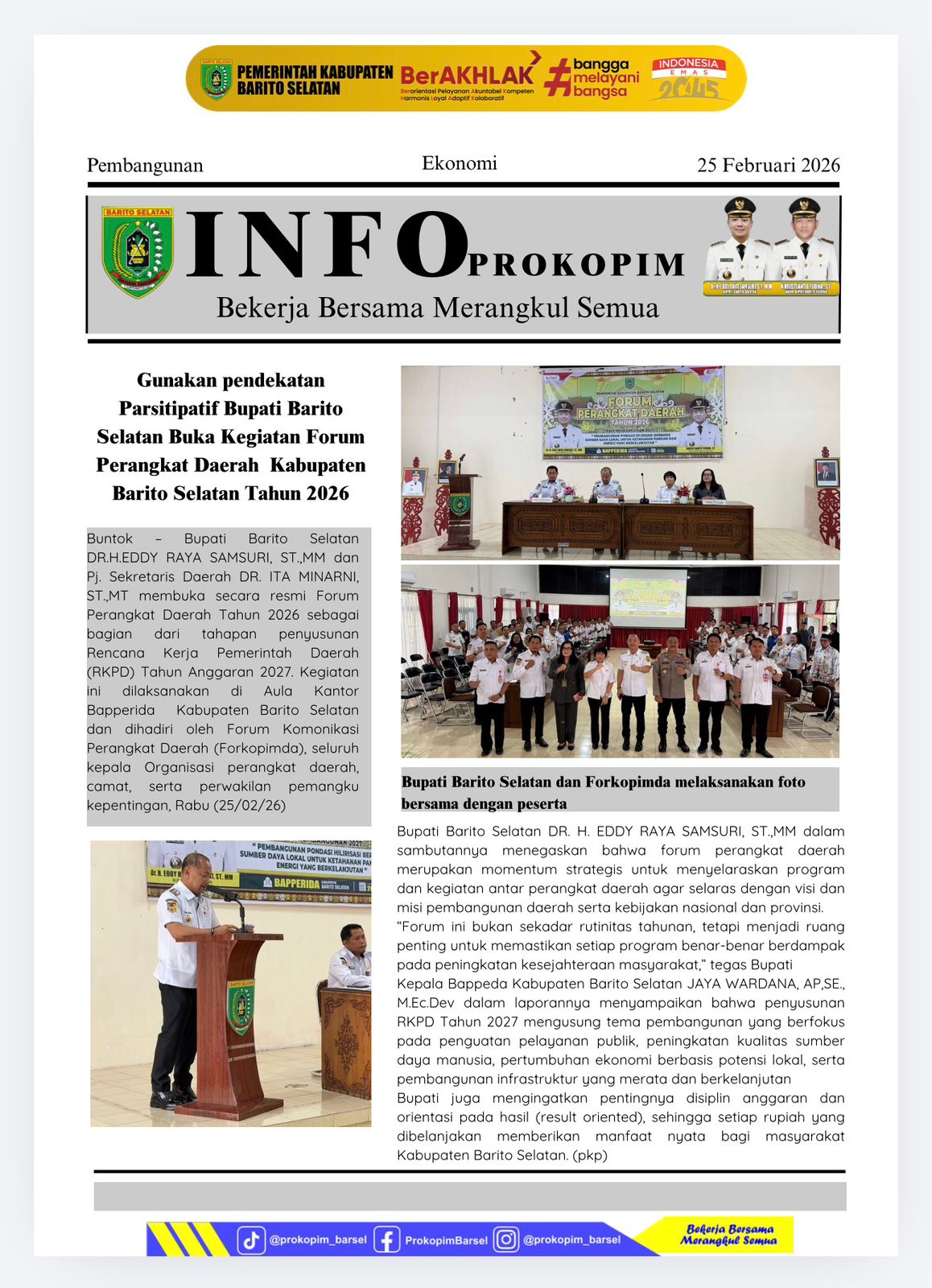 Bupati Barito Selatan Dr. H. Eddy Raya Samsuri, S.T., MM membuka secara resmi Forum Perangkat Daerah Kabupaten Barito Selatan, bertempat di Aula Bapperida Barito Selatan, pada hari Rabu, 25/02/2026. Turut hadir Pj. Sekretaris Daerah Barito Selatan, Dr. Ita Minarni, S.T., M.T, unsur Forkopimda Kabupaten Barito Selatan, dan seluruh Kepala OPD yang ada di lingkup Pemerintah Kabupaten Barito Selatan. Informasi terkait kegiatan tersebut dapat disimak melalui infografis berikut :