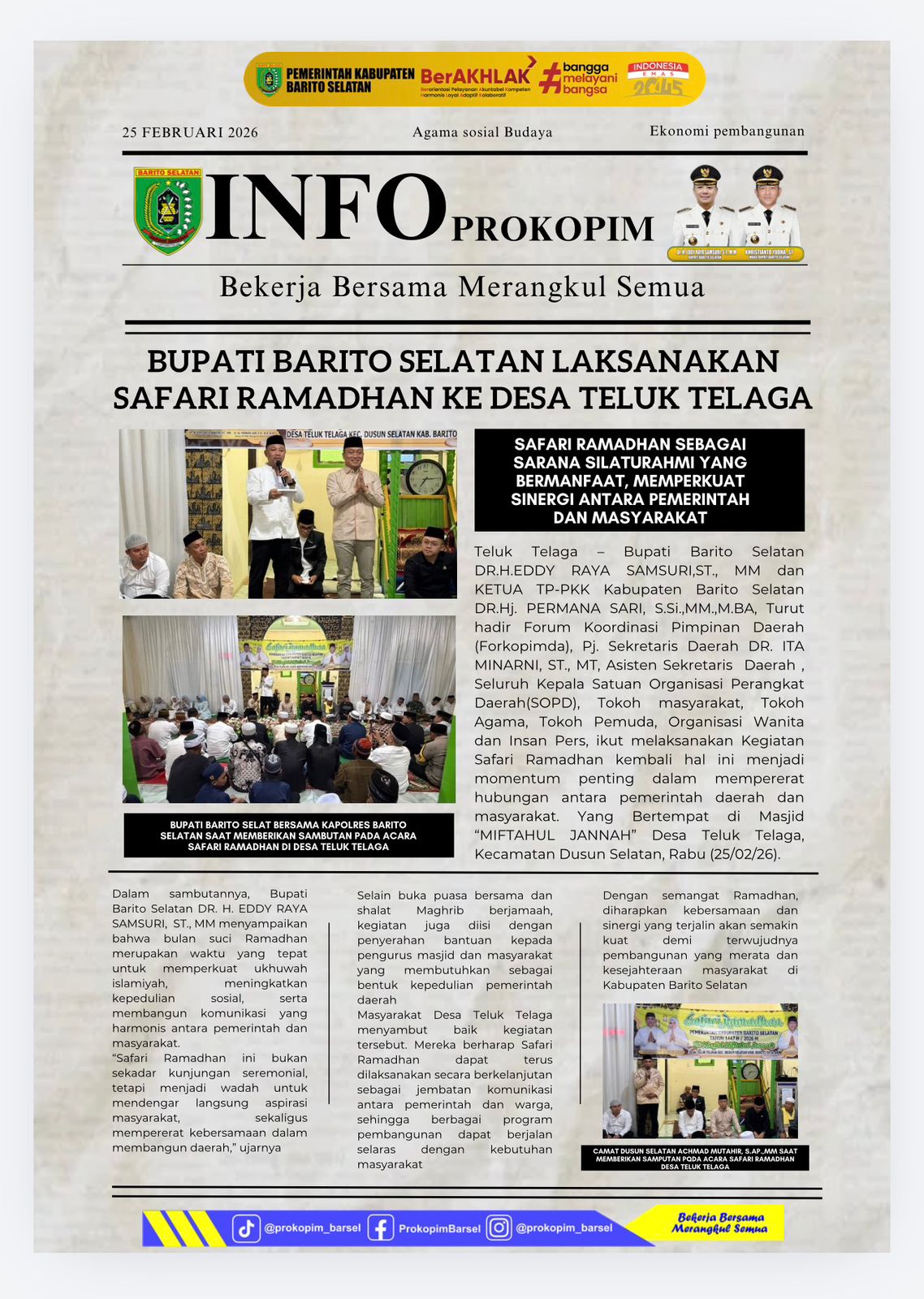 Pemerintah Kabupaten Barito Selatan dalam hal ini Bupati Barito Selatan Dr. H. Eddy Raya Samsuri S.T., MM didampingi Ketua TP PKK Barito Selatan Dr. Hj Permana Sari, S.Si., MM., M.Ba melaksanakan Safari Ramadhan Pemerintah Kabupaten Barito Selatan 1447 H / 2026 bertempat di Masjid Miftahul Jannah, Desa Teluk Telaga Kecamatan Dusun Selatan Kabupaten Barito Selatan, Rabu 25/02/2026.