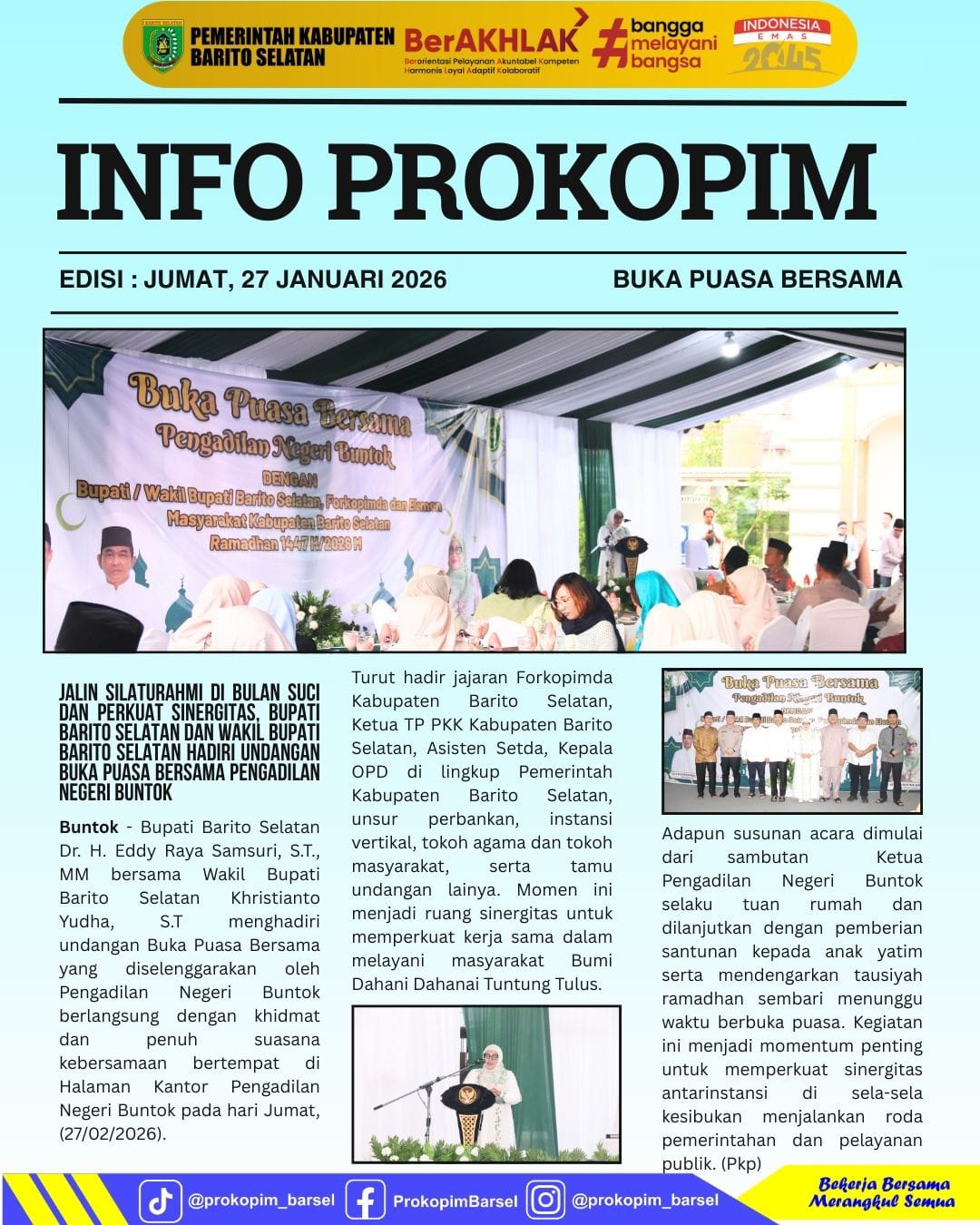 Bupati Barito Selatan Dr. H. Eddy Raya Samsuri, S.T., MM bersama Wakil Bupati Barito Selatan Khristianto Yudha, S.T menghadiri undangan Buka Puasa Bersama yang diselenggarakan oleh Pengadilan Negeri Buntok berlangsung dengan khidmat dan penuh suasana kebersamaan bertempat di Halaman Kantor Pengadilan Negeri Buntok pada hari Jumat, (27/02/2026).Turut hadir jajaran Forkopimda Kabupaten Barito Selatan, Ketua TP PKK Barito Selatan, Asisten Setda, Kepala OPD dan tamu undangan lainnya. Informasi seputar kegiatan dapat disimak melalui infografis berikut: