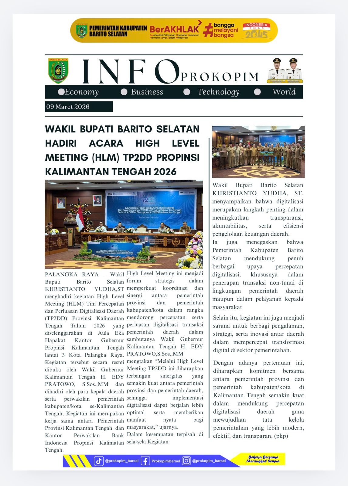 Wakil Bupati Barito Selatan Khristianto Yudha, S.T didampingi Kepala BAPENDA dan Kepala BPKAD Kabupaten Barito Selatan menghadiri acara Launching E-Pahari & EDC Bank Kalteng dan Rapat Koordinasi TP2DD se- Provinsi Kalimantan Tengah dirangkaikan dengan Kick Off Mini Championship TP2DD Provinsi Kalimantan Tengah bertempat di Aula Eka Hapakat Lt. 3 Kantor Gubernur Kalimantan Tengah, di Palangka Raya, Senin (09/03/2026). Simak informasi melalui infografis berikut.