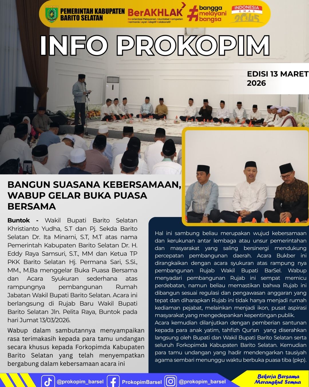 Wakil Bupati Barito Selatan Khristianto Yudha, S.T dan Pj. Sekda Barito Selatan Dr. Ita Minarni, S.T, M.T atas nama Pemerintah Kabupaten Barito Selatan dalam hal ini Dr. H. Eddy Raya Samsuri, S.T., MM dan Ketua TP PKK Barito Selatan Hj. Permana Sari, S.Si., MM., M.Ba menggelar Buka Puasa Bersama dan Acara Syukuran sederhana atas rampungnya pembangunan Rumah Jabatan Wakil Bupati Barito Selatan. Acara ini berlangsung di Rujab Baru Wakil Bupati Barito Selatan Jln. Pelita Raya, Buntok pada hari Jumat 13/03/2026. Informasi tersaji pada infografis berikut.