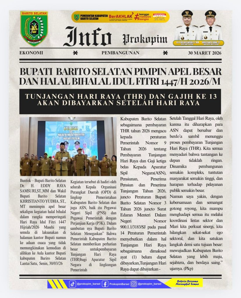 Bupati Barito Selatan Dr. H. Eddy Raya Samsuri, S.T., MM memimpin langsung Apel Gabungan dan Halal Bihalal Dalam Rangka Idul Fitri 1447H di Lingkup Pemerintah Kabupaten Barito Selatan. Kegiatan ini semula di rencanakan pada Halaman Kantor Bupati Barito Selatan, namun dikarenakan kondisi cuaca yang tidak memungkinkan, kegiatan dialihkan ke Aula Kantor Bupati Barito Selatan dan diselenggarakan secara sederhana namun khidmat pada hari Senin, 30/03/2026. Turut hadir Wakil Bupati Barito Selatan Khristianto Yudha, S.T., M.T, para Asisten Sekretaris Daerah, Kepala OPD serta seluruh ASN di lingkup Pemkab Barito Selatan. Informasi seputar kegiatan dapat disimak melalui infografis berikut.