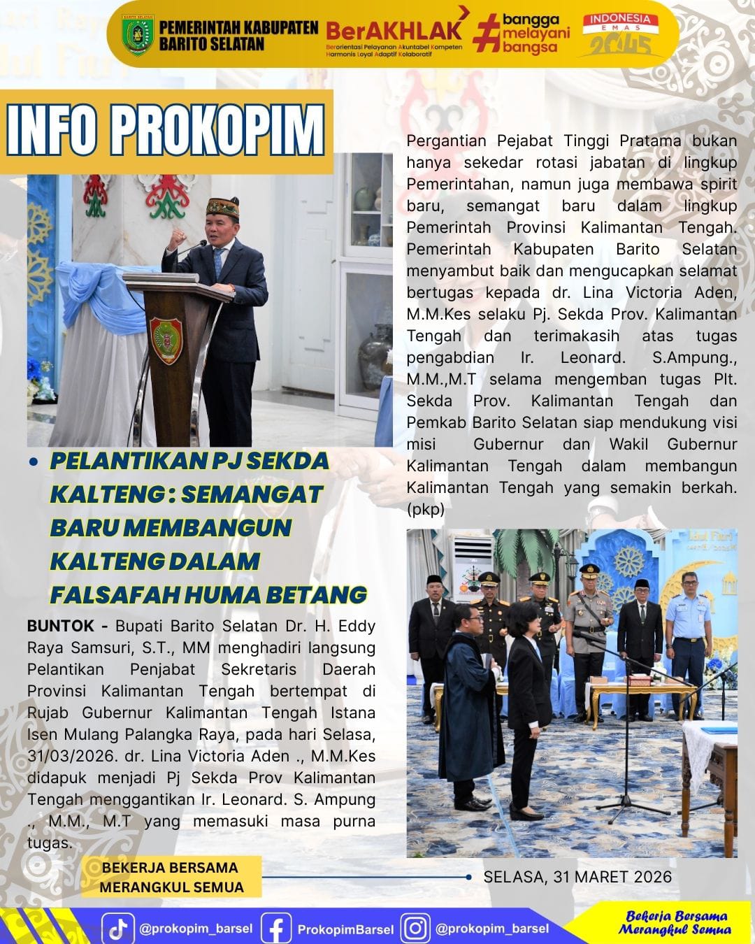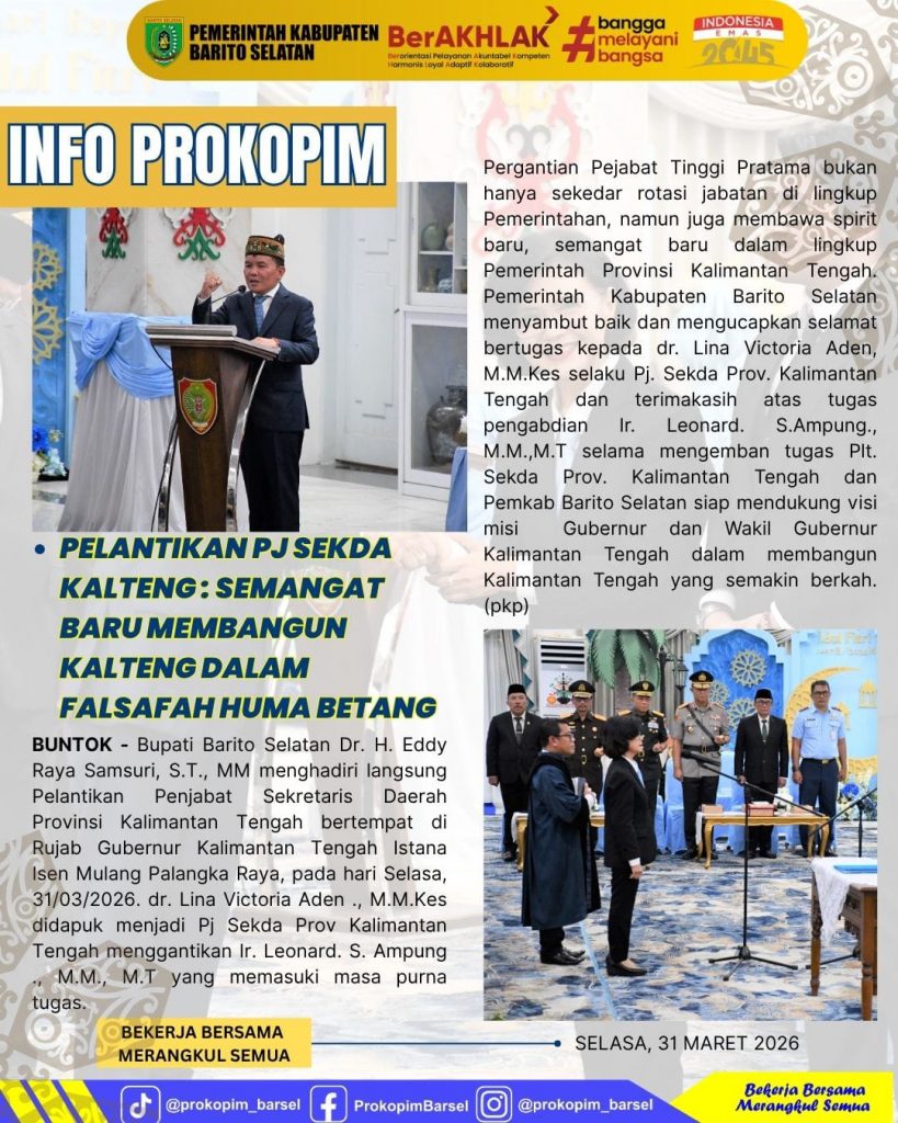 Bupati Barito Selatan Dr. H. Eddy Raya Samsuri, S.T., MM menghadiri langsung Pelantikan Penjabat Sekretaris Daerah Provinsi Kalimantan Tengah bertempat di Rujab Gubernur Kalimantan Tengah Istana Isen Mulang Palangka Raya, pada hari Selasa, 31/03/2026. dr. Lina Victoria Aden ., M.M.Kes didapuk menjadi Pj Sekda Prov Kalimantan Tengah menggantikan Ir. Leonard. S. Ampung ., M.M., M.T yang memasuki masa purna tugas. Informasi seputar kegiatan dapat disimak melalui infografis berikut: